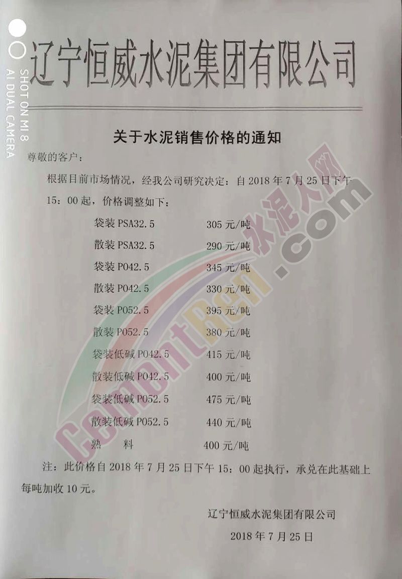 【水泥人網(wǎng)】昨日(25日)遼寧恒威水泥集團有限公司發(fā)布關(guān)于水泥銷售價格的通知,通知稱,根據(jù)目前市場情況,經(jīng)公司研究決定,自2018年7月25日下午15時起,調(diào)整各品種水泥產(chǎn)品價格。詳情如下: