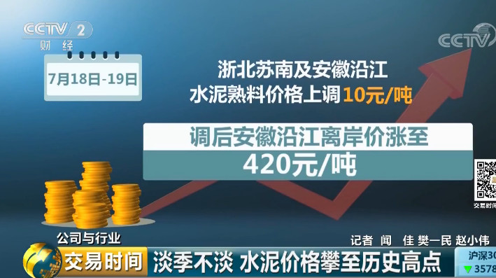 數(shù)據(jù)顯示,7月18日到19日,浙北蘇南及安徽沿江水泥熟料價格上調(diào)10元/噸,調(diào)后安徽沿江水泥熟料離岸價漲至420元/噸。