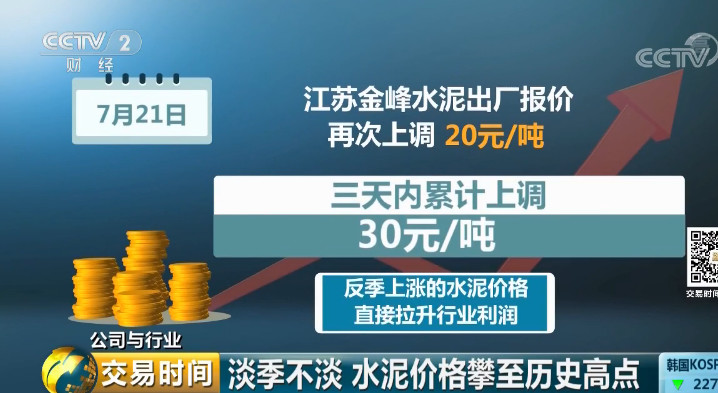 7月21日,江蘇金峰水泥出廠報價再次上調(diào)20元/噸,三天內(nèi)累計(jì)上調(diào)30元/噸,領(lǐng)漲區(qū)域市場。反季上漲的水泥價格,也直接拉升了行業(yè)利潤。