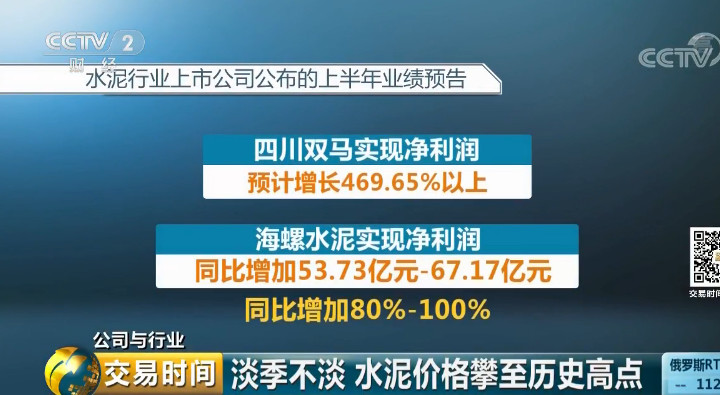 四川雙馬上半年實(shí)現(xiàn)凈利潤預(yù)計(jì)增長469.65%以上。海螺水泥上半年實(shí)現(xiàn)凈利同比增加53.73億元-67.17億元人民幣,同比增加80%-100%。