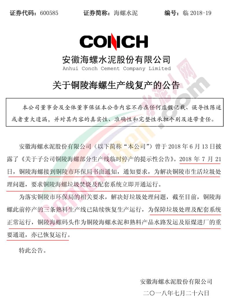 海螺水泥(00914)公告,2018年7月21日,銅陵海螺接到銅陵市環(huán)保局書面通知,通知要求,為解決銅陵市生活垃圾處理問題,要求銅陵海螺垃圾焚燒及配套系統(tǒng)立即開通運行。