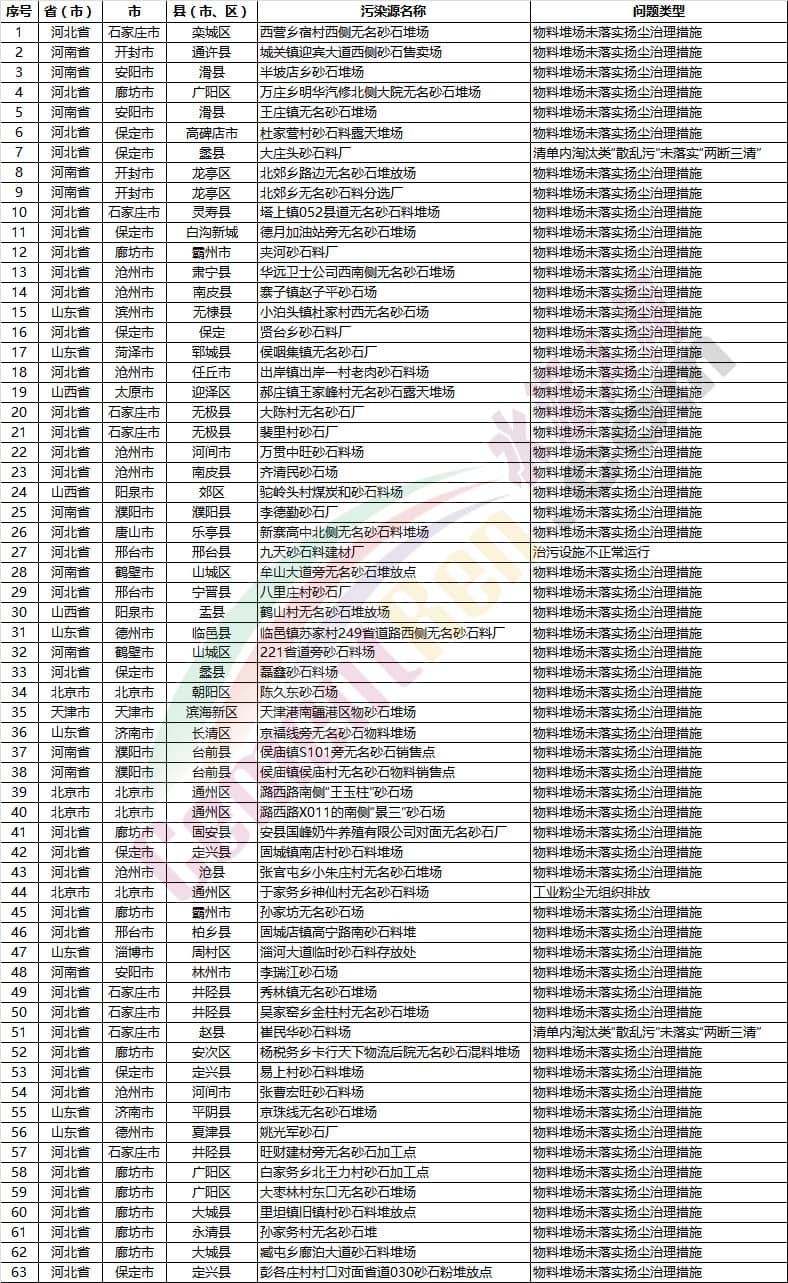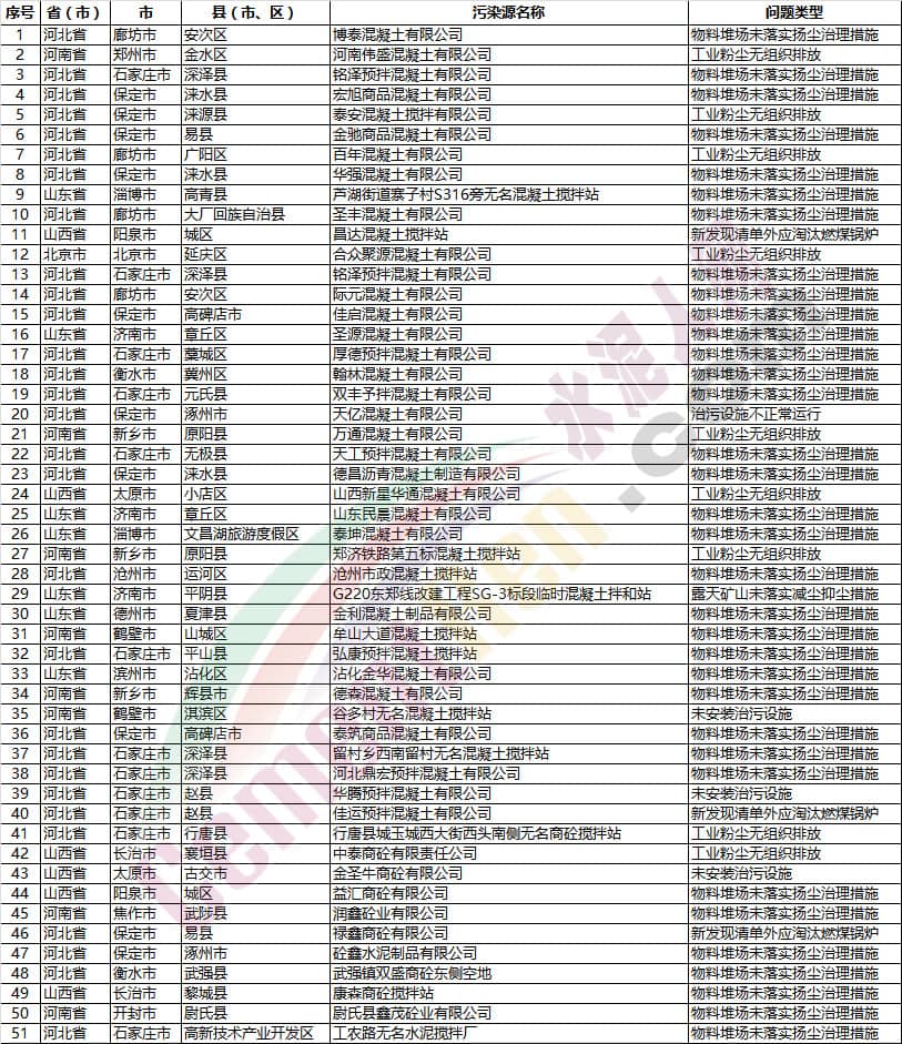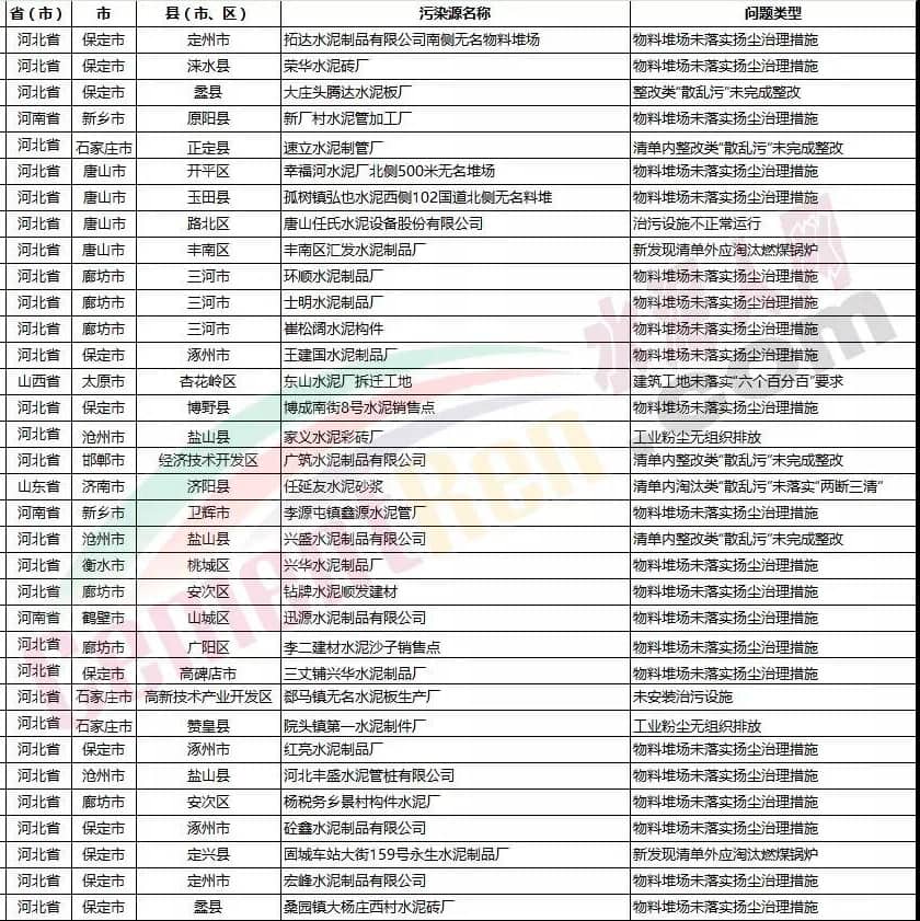 【水泥人網(wǎng)】7月份,2018-2019年藍(lán)天保衛(wèi)戰(zhàn)重點(diǎn)區(qū)域強(qiáng)化督查工作繼續(xù)開展,200個(gè)督查組按照工作方案要求,對(duì)京津冀及周邊地區(qū)204個(gè)縣(市、區(qū))進(jìn)行督查。發(fā)現(xiàn)多個(gè)涉氣環(huán)境問題,其中涉及水泥企業(yè)、混凝土(商砼)企業(yè)、砂石企業(yè)的如下: