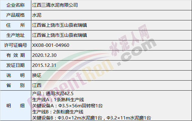 據質監(jiān)總局生產許可證辦公室數據顯示,江西三清水泥有限公司生產地址位置江西省上饒市玉山縣巖瑞鎮(zhèn),原生產線規(guī)模為一條熟料生產線,關鍵設備為Φ3.5×56m回轉窯1臺。兩條水泥粉磨生產線,關鍵設備為Φ3.0×12m水泥磨1臺,Φ3.2×11m水泥磨1臺。