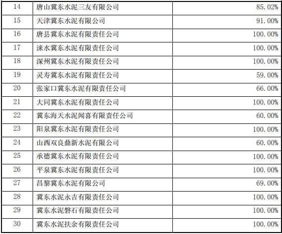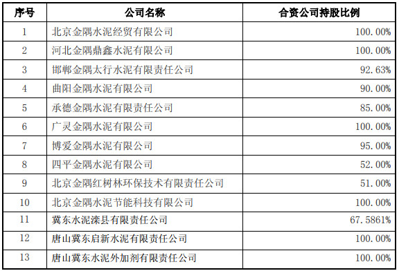 2018年6月21日,唐山冀東水泥股份有限公司唐山分公司及唐山冀東水泥股份有限公司營(yíng)銷分公司完成工商變更登記手續(xù),冀東水泥完成以分公司資產(chǎn)對(duì)合資公司的出資。 2018年7月26日,公司所持有的北京金隅水泥經(jīng)貿(mào)有限公司等 10 家公司的股權(quán)以及冀東水泥所持有的冀東水泥灤縣有限責(zé)任公司等 20 家公司的股權(quán)已全部過(guò)戶至合資公司,并完成相關(guān)工商變更登記手續(xù)。具體情況如下表所示: