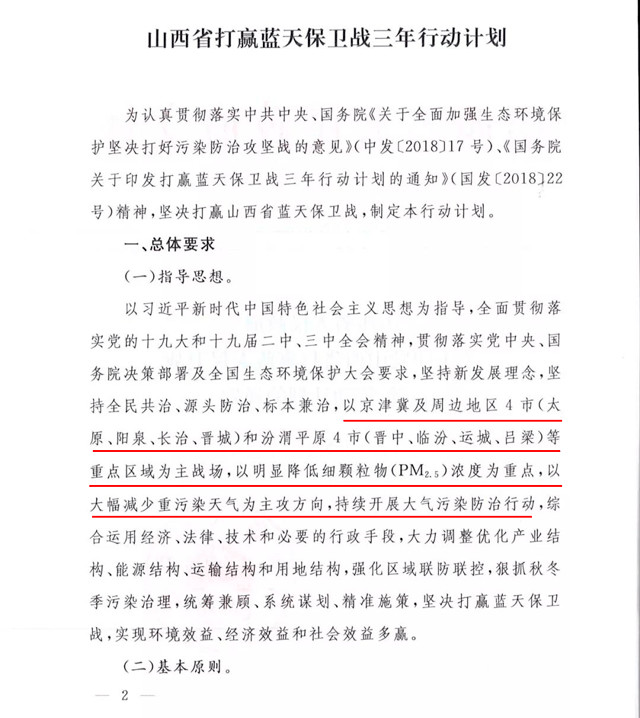 行動計(jì)劃以京津冀及周邊地區(qū)4市(太原、陽泉、長治、晉城)和汾渭平原4市(晉中、臨汾、運(yùn)城、呂梁)等重點(diǎn)區(qū)域?yàn)橹鲬?zhàn)場,以明顯降低細(xì)顆粒物(PM2.5)濃度為重點(diǎn),以大幅減少重污染天氣為主攻方向,持續(xù)開展大氣污染防治行動。