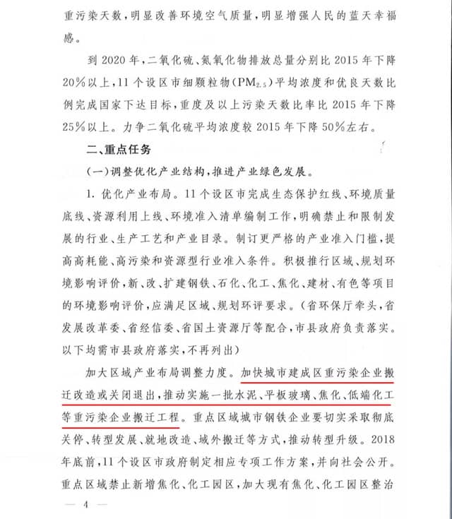 計(jì)劃的重點(diǎn)任務(wù)中提到調(diào)整優(yōu)化產(chǎn)業(yè)結(jié)構(gòu),推進(jìn)產(chǎn)業(yè)綠色發(fā)展。加大區(qū)域產(chǎn)業(yè)布局調(diào)整力度,加快城市建成區(qū)重污染企業(yè)搬遷改造或關(guān)閉退出,推動實(shí)施水泥、平板玻璃、焦化、低端化工等重污染企業(yè)搬遷工程。