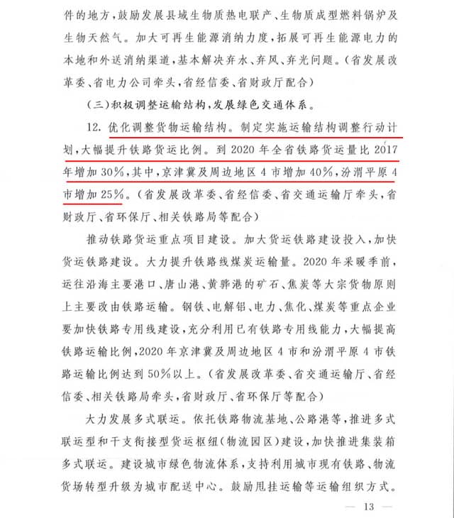 積極調(diào)整運(yùn)輸結(jié)構(gòu),發(fā)展綠色交通體系。優(yōu)化調(diào)整貨物運(yùn)輸結(jié)構(gòu),制定實(shí)施運(yùn)輸結(jié)構(gòu)調(diào)整行動計(jì)劃,大幅提升鐵路貨運(yùn)比例。
