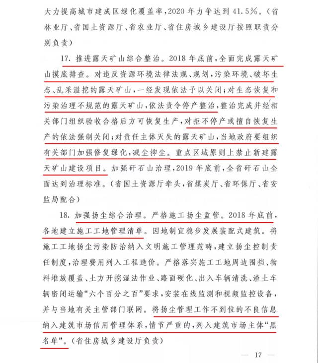 推進(jìn)露天礦山綜合整治,2018年底前,全面完成露天礦山摸底排查。對違反資源環(huán)境法律法規(guī)、規(guī)劃,污染環(huán)境、破壞生態(tài)、亂采濫亂的露天礦山,一經(jīng)發(fā)現(xiàn)依法予以關(guān)閉;對生態(tài)恢復(fù)和污染治理不規(guī)范的露天礦山,依法責(zé)令停產(chǎn)整治。對拒不停產(chǎn)或擅自恢復(fù)生產(chǎn)的依法強(qiáng)制關(guān)閉,對責(zé)任主體滅失的露天礦山,當(dāng)?shù)卣M織有關(guān)部門加強(qiáng)修復(fù)綠化,減塵抑塵。重點(diǎn)區(qū)域原則上禁止新建露天礦山建設(shè)項(xiàng)目。
