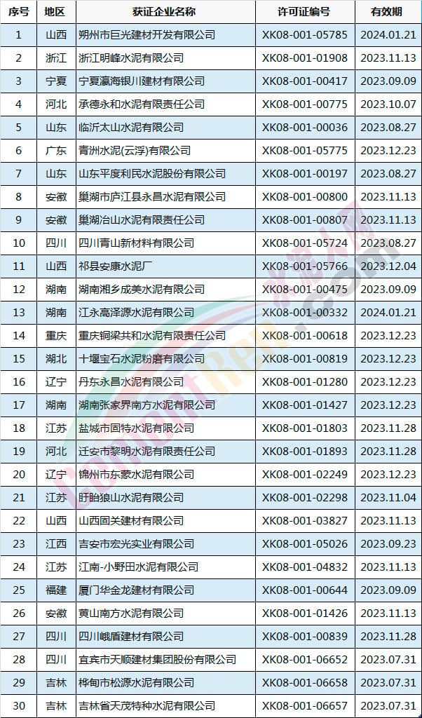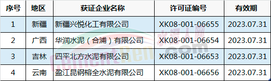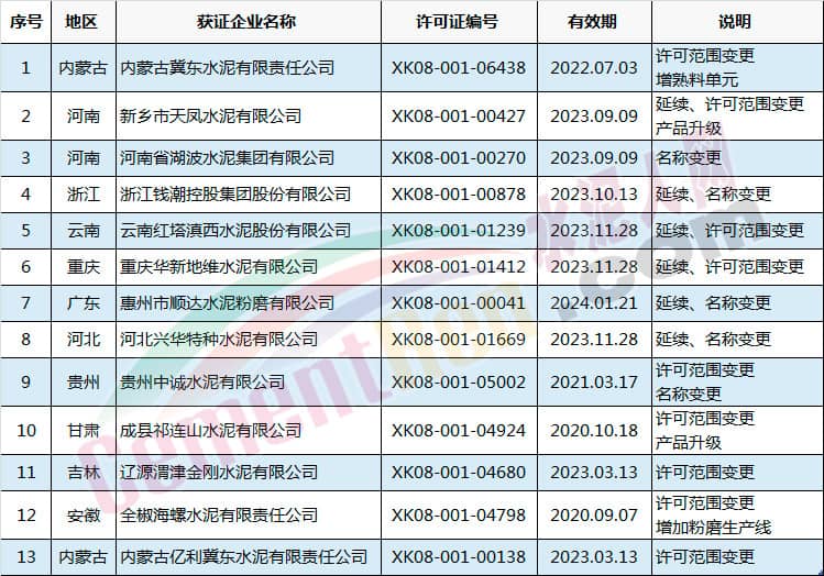 許可范圍變更同時產品升級的有新鄉(xiāng)市天鳳水泥有限公司和成縣祁連山水泥有限公司。涉及名稱變更的共有5家企業(yè),分別為河南省湖波水泥集團有限公司、浙江錢潮控股集團股份有限公司、惠州市順達水泥粉磨有限公司、河北興華特種水泥有限公司和貴州中誠水泥有限公司。
