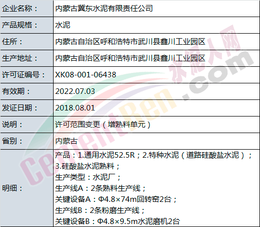 變更項目中,涉及許可范圍變更的共有9家企業(yè),其中內蒙古冀東水泥有限責任公司增加熟料單元。增加后: