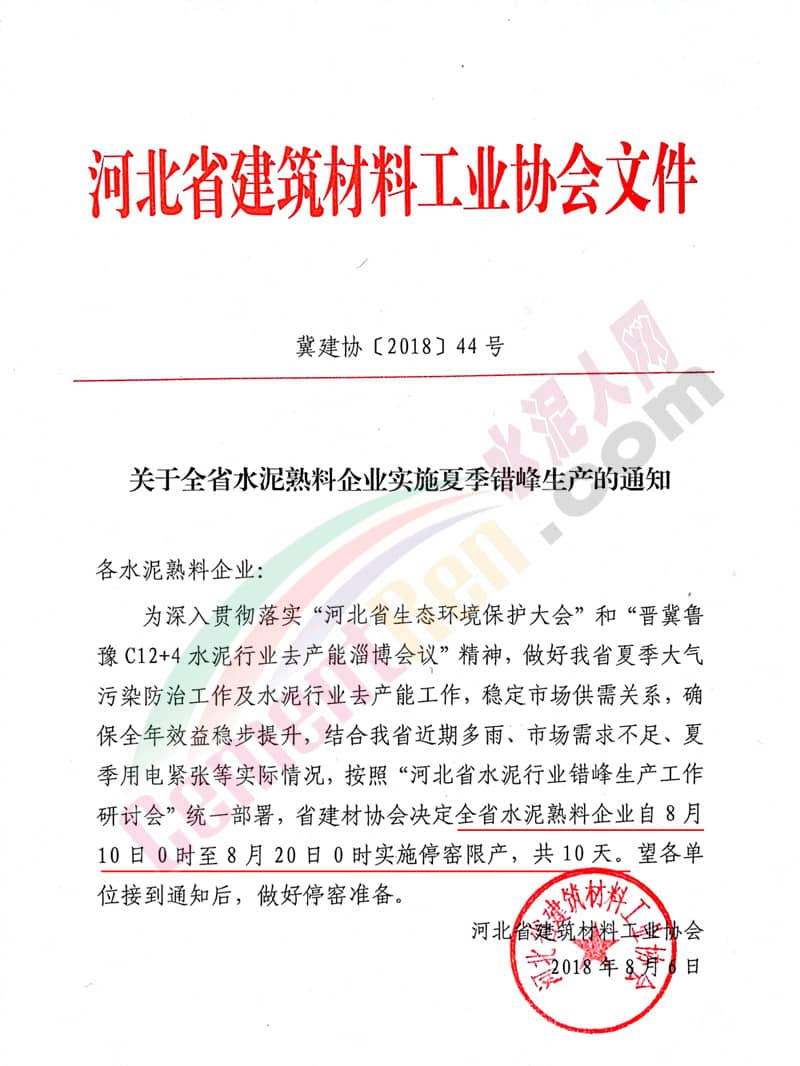 【水泥人網(wǎng)】水泥人網(wǎng)消息,昨日(8月6日)河北省建筑材料工業(yè)協(xié)會(huì)發(fā)布冀建協(xié)【2018】44號(hào)文件,《關(guān)于全省水泥熟料企業(yè)實(shí)施夏季錯(cuò)峰生產(chǎn)的通知》(以下簡(jiǎn)稱(chēng)“通知文件”。