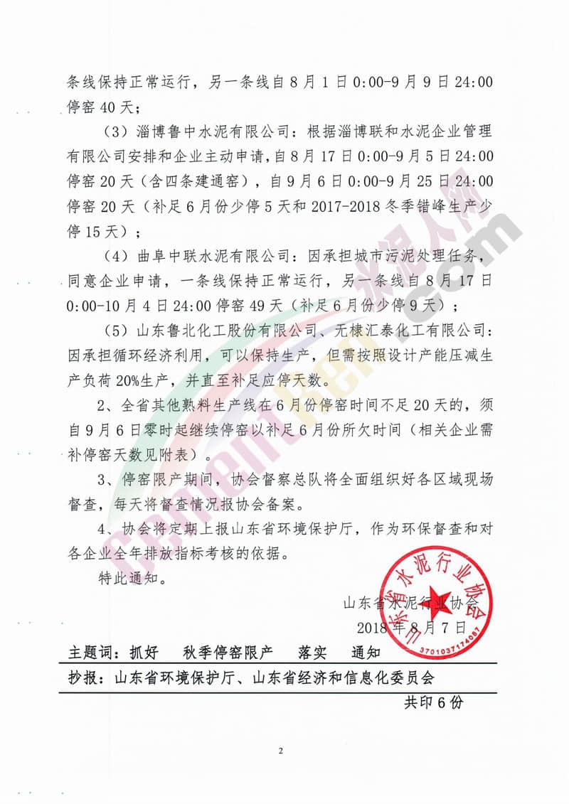 曲阜中聯(lián)水泥有限公司:因承擔(dān)城市污染處理任務(wù)同意企業(yè)申請,一條線保持正常運行,另一條線自8月17日0點到時10月4日24點停窯49天(補足6月份少停9天)