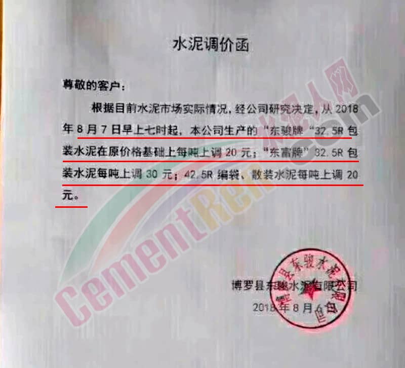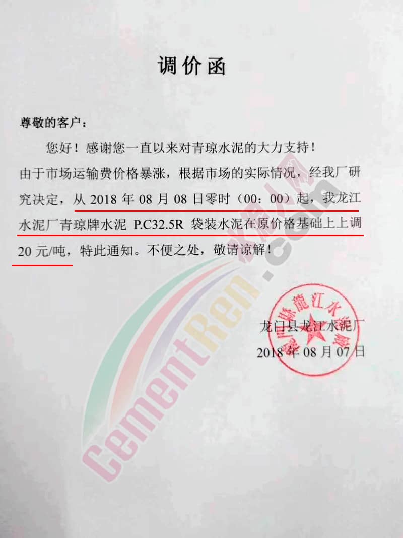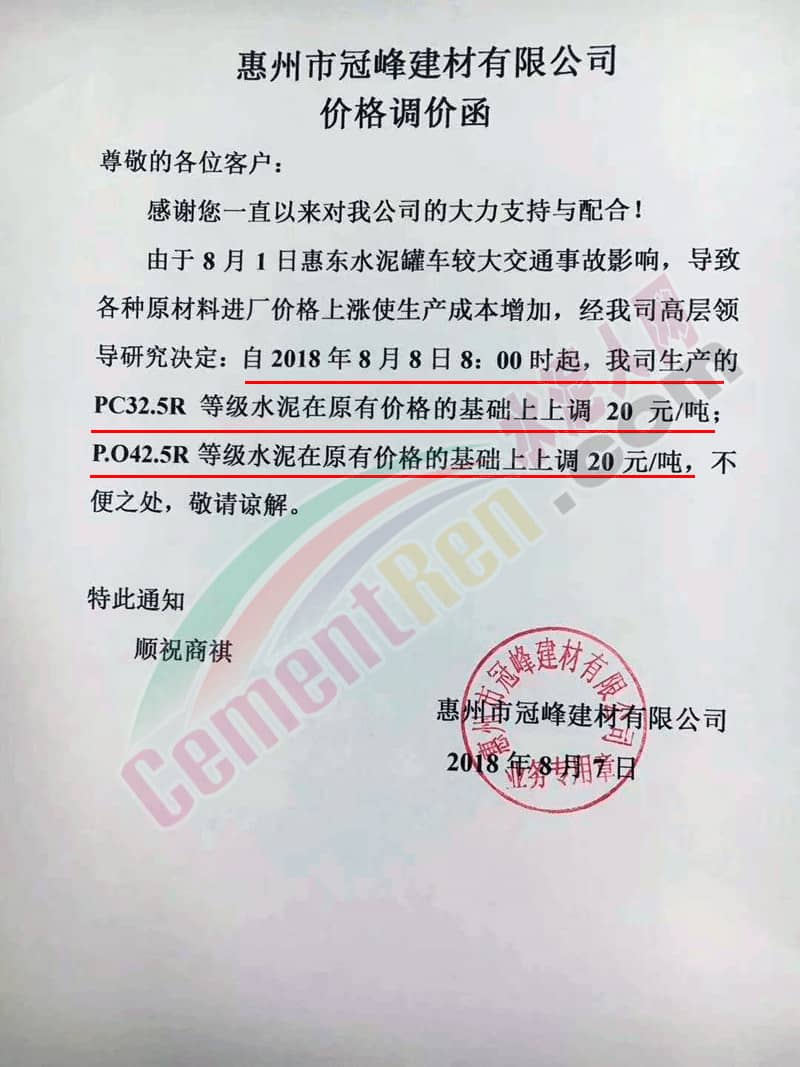 惠州市冠峰建材有限公司近兩日連續(xù)發(fā)布了兩次調(diào)價函,其中8月6日發(fā)布的漲價函稱,由于8月1日惠東水泥罐車較大交通事故影響,導(dǎo)致各種原材料進(jìn)廠價格上漲使生產(chǎn)成本增加,經(jīng)公司高層領(lǐng)導(dǎo)研究決定,自8月7日早8點起上調(diào)PC32.5R和PO42.5R等級水泥價格,上調(diào)幅度在20元/噸。隔日又發(fā)通知稱在原價基礎(chǔ)上再漲20元/噸。