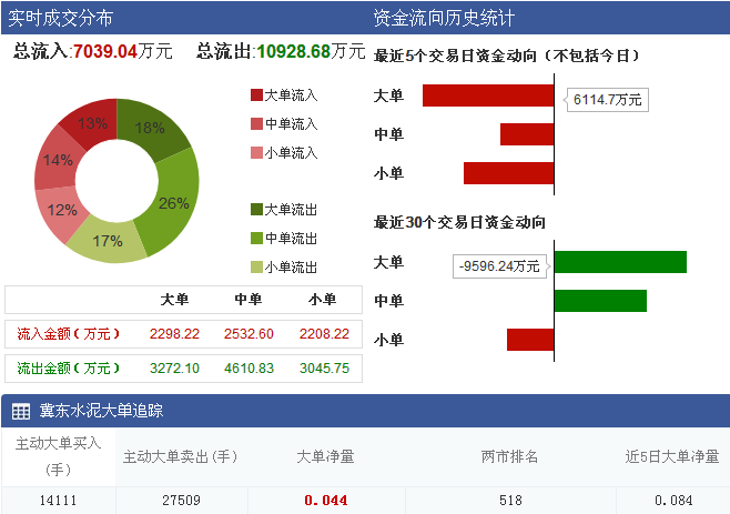 冀東水泥(000401)今日大單金額占總成交金額的 4.37%,近5日內(nèi)資金凈流入709.69萬元,高于行業(yè)平均水平-306.69萬元。