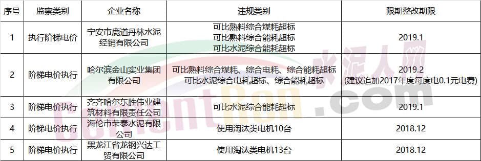 【水泥人網(wǎng)】昨日(8月9日)黑龍江工信委發(fā)布公示文件稱(chēng):根據(jù)《工業(yè)和信息化部關(guān)于印發(fā)〈2018年工業(yè)節(jié)能監(jiān)察重點(diǎn)工作計(jì)劃〉的通知》(工信部節(jié)函〔2018〕73號(hào))、《國(guó)家發(fā)改委 工信部關(guān)于水泥企業(yè)用電實(shí)行階梯電價(jià)政策有關(guān)問(wèn)題的通知》(發(fā)改價(jià)格〔2016〕75號(hào))部署、要求及相關(guān)規(guī)定,將第一階段監(jiān)察違規(guī)企業(yè)未整改情況向社會(huì)公示,并請(qǐng)各界監(jiān)督。如有異議,可在公示期內(nèi)實(shí)名反映。