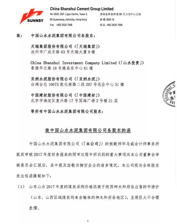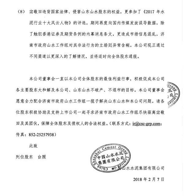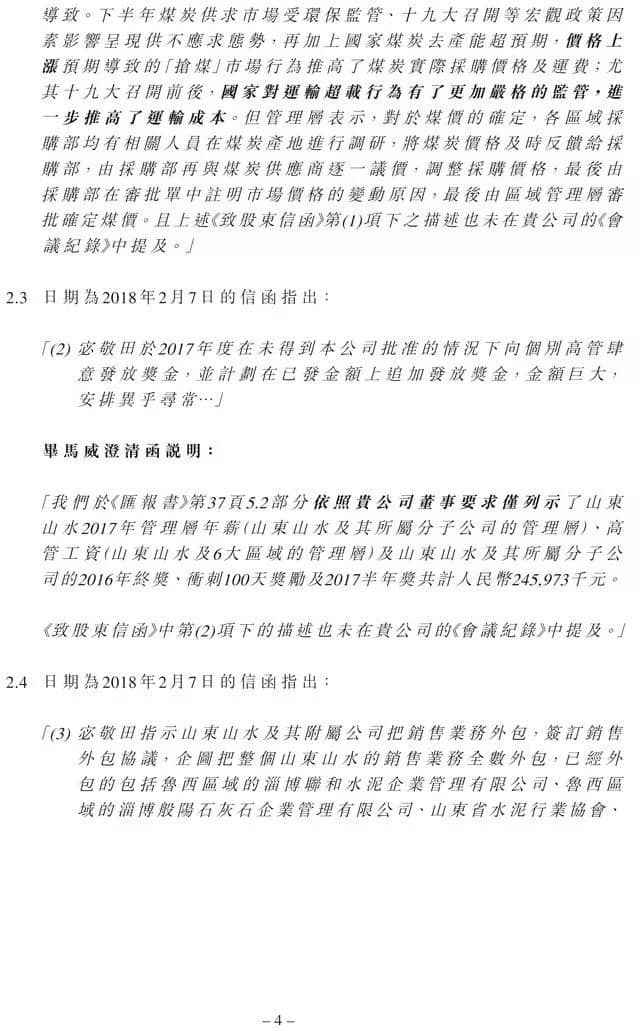 宓敬田指示山東水泥及其附屬公司于2018年1月大量體現(xiàn),完全不顧全體附屬公司于停產(chǎn)時(shí)期的正常工作發(fā)放和企業(yè)營(yíng)運(yùn)的現(xiàn)金需要,等等。