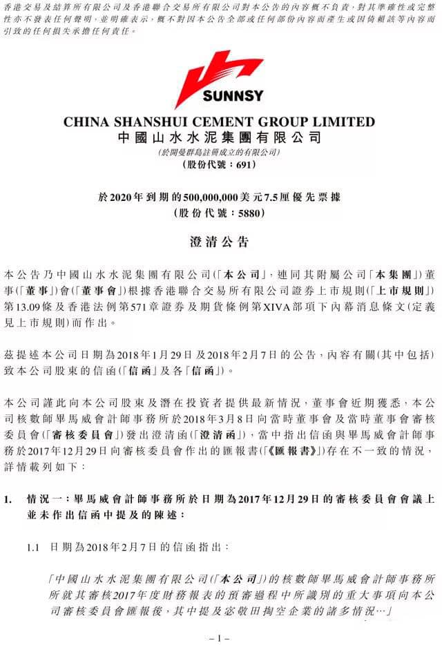 山水水泥(00691.HK) 2018年7月11日晚間發(fā)布公告,公司聘請(qǐng)的會(huì)計(jì)師事務(wù)所畢馬威表示,2018年1月29日及2018年2月7日,公司發(fā)布的《致股東的信函》的公告有多處失實(shí)之處。