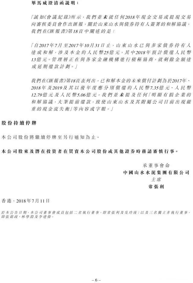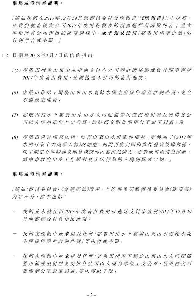 針對(duì)“計(jì)劃出售生產(chǎn)線”一項(xiàng),畢馬威表示,“我們?cè)趨R報(bào)中并未提及任何‘宓敬田指示下屬將山東山水幾條水泥生產(chǎn)線停產(chǎn)并計(jì)劃外賣’等內(nèi)容或字眼。”
