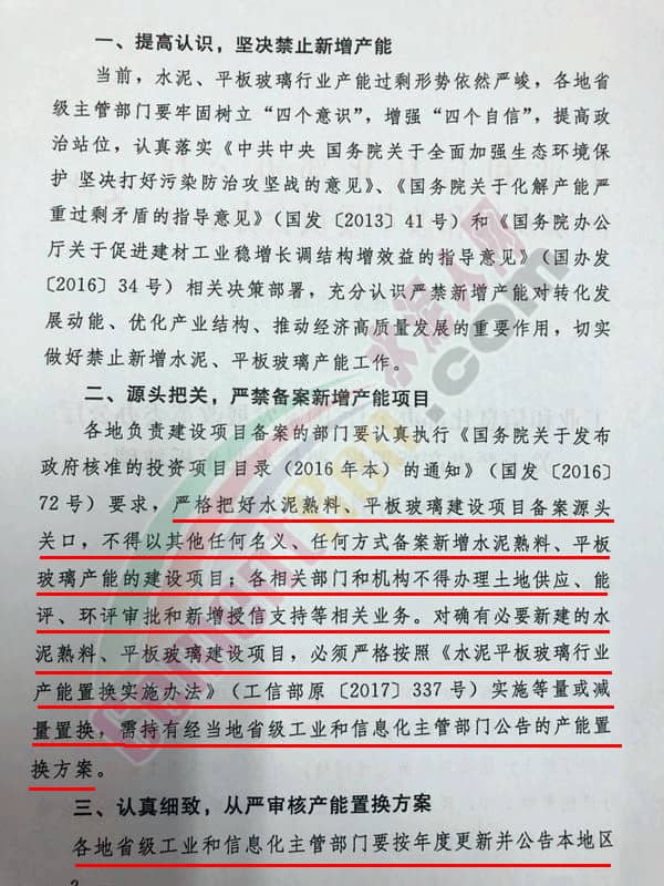 各地負責建設項目備案的部門要認真執(zhí)行《國務院關于發(fā)布政府核準的投資項目目錄(2016年本)的通知》(國發(fā)[2016]72號)要求,嚴格把好水泥熟料、平板玻璃建設項目備案源頭關口,不得以其他任何名義、任何方式備案新增水泥熟料、平板玻璃產(chǎn)能的建設項目;各相關部門和機構不得辦理土地供應、能評、環(huán)評審批和新增授信支持等相關業(yè)務。對確有必要新建的水泥熟料、平板玻璃建設項目,必須嚴格按照《水泥平板玻璃行業(yè)產(chǎn)能置換實施辦法》(工信部原[2017]337號)實施等量或減量置換,需持有經(jīng)當?shù)厥〖壒I(yè)和信息化主管部門公告的產(chǎn)能置換方案。
