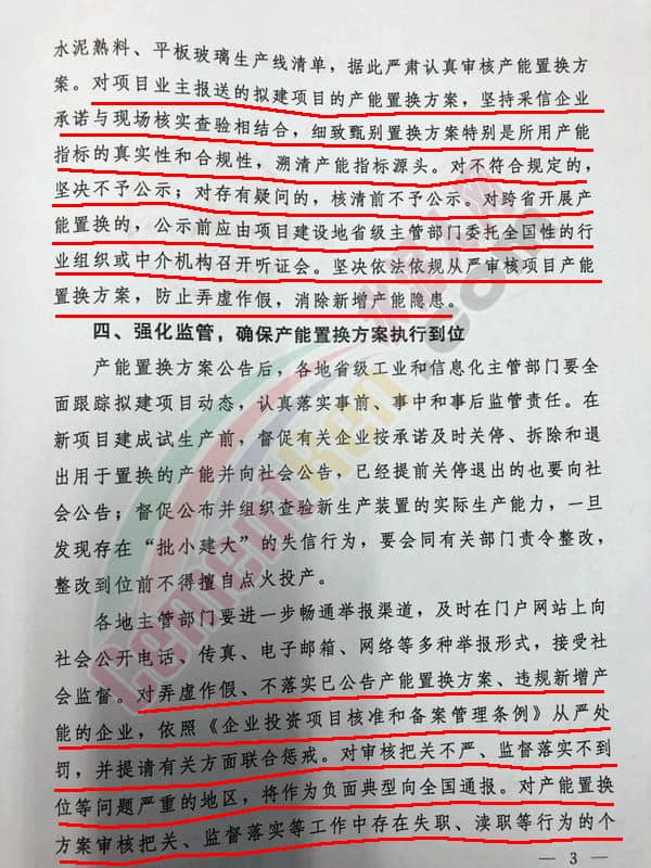 各地省級工業(yè)和信息化主管部門要按年度更新并公告本地區(qū)水泥熟料、平板玻璃生產(chǎn)線清單,據(jù)此嚴肅認真審核產(chǎn)能置換方案。對項目業(yè)主報送的擬建項目的產(chǎn)能置換方案,堅持采信企業(yè)承諾與現(xiàn)場核實查驗相結合,細致甄別置換方案特別是所用產(chǎn)能指標的真實性和合規(guī)性,溯清產(chǎn)能指標源頭。對不符合規(guī)定的,堅決不予公示;對存有疑問的,核清前不予公示。對跨省開展產(chǎn)能置換的,公示前應由項目建設地省級主管部門委托全國性的行業(yè)組織或中介機構召開聽證會。堅決依法依規(guī)從嚴審核項目產(chǎn)能置換方案,防止弄虛作假,消除新增產(chǎn)能隱患。