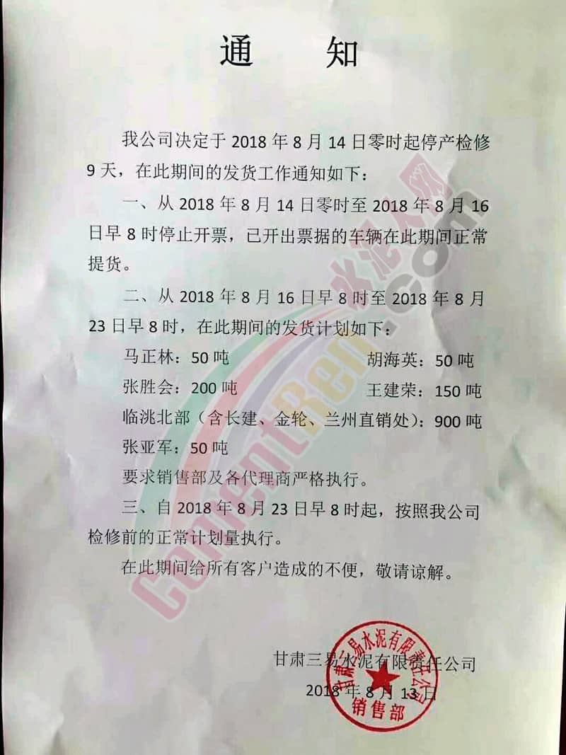 三易水泥限量供應(yīng)通知稱自今日(14日)零時(shí)起停產(chǎn)檢修9天。且從今日起至8月16日早8時(shí)停止開票,已開票車輛在此期間正常提貨。從8月16日早8點(diǎn)至8月23日早8點(diǎn),限量供應(yīng)水泥并要求銷售部及各代理商嚴(yán)格執(zhí)行。8月23日早8點(diǎn)將恢復(fù)檢修前正常計(jì)劃量執(zhí)行。