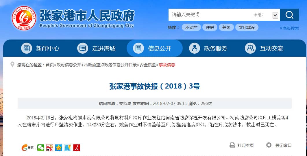 2018年2月6日,張家港海螺水泥有限公司將原材料庫清庫作業(yè)發(fā)包給河南省防腐保溫開發(fā)有限公司。河南防腐公司清庫工姚蓋等4人在粉末庫內(nèi)進(jìn)行庫壁清灰作業(yè),14時(shí)30分左右,姚蓋作業(yè)時(shí)不慎墜落至庫底(墜落高度3米),陷在庫底灰沙中,救出時(shí)已死亡。