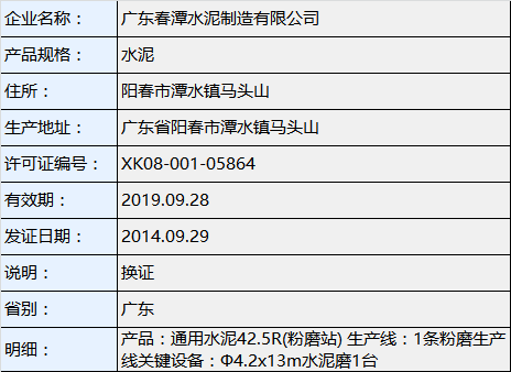 據(jù)查詢,廣東春潭水泥制造有限公司在2014年9月29日換領(lǐng)了生產(chǎn)許可證,生產(chǎn)線為1條粉磨生產(chǎn)線關(guān)鍵設(shè)備為Φ4.2x13m水泥磨1臺(tái)。