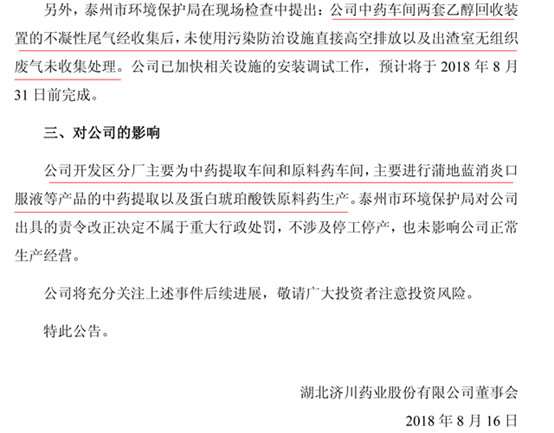 企業(yè)上市公司8月16日公告顯示,2018年7月3-4日,泰州市環(huán)境保護局對公司廢水、廢渣及廢氣的處理情況進(jìn)行了現(xiàn)場檢查。根據(jù)《泰興市環(huán)境監(jiān)測站監(jiān)測報告(環(huán)監(jiān)(氣)字(2018)第(074)號)》,濟川藥業(yè)集團有限公司廢氣排放口(西廠)非甲烷總烴排放濃度均值超標(biāo)0.08倍。