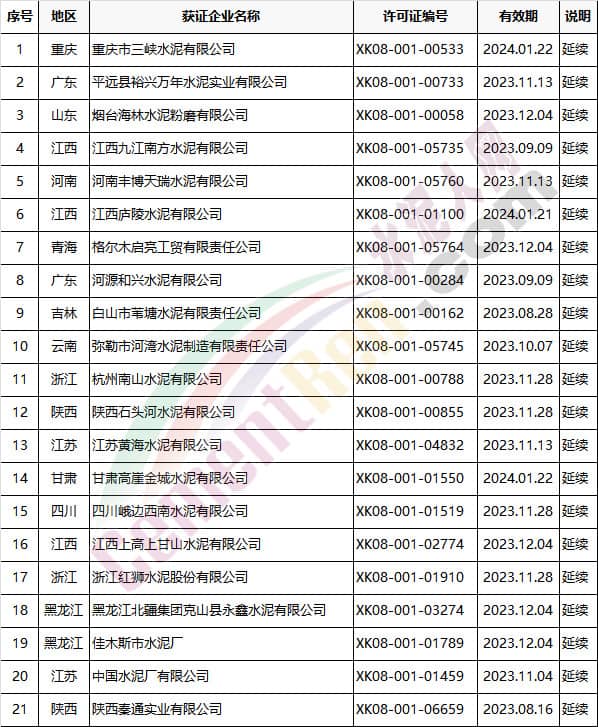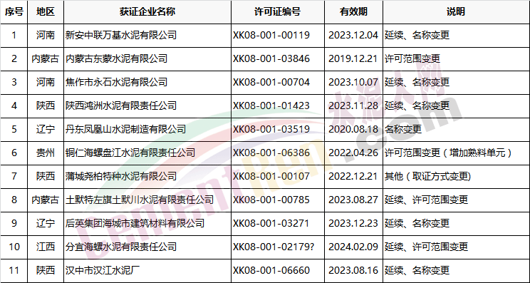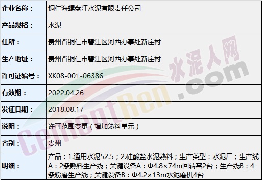 以上涉及變更的企業(yè)中,貴州銅仁海螺盤江水泥有限責任公司許可范圍變更內(nèi)容為增加熟料單元;陜西蒲城堯柏特種水泥有限公司為取證方式變更。變更后生產(chǎn)許可證詳情如下: