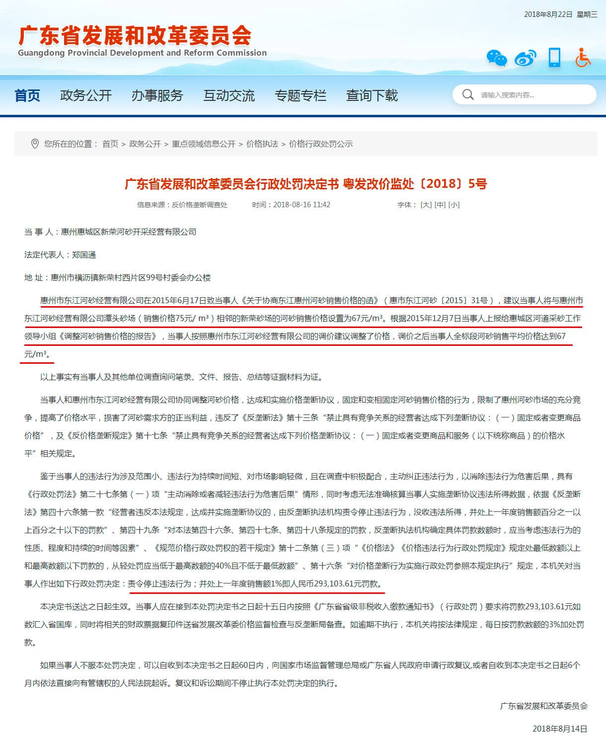 【水泥人網(wǎng)】日前,廣東省發(fā)改委發(fā)布行政處罰決定書(粵發(fā)改價(jià)監(jiān)處〔2018〕5號(hào)),責(zé)令惠州惠城區(qū)新榮河砂開采經(jīng)營有限公司停止違法行為;并處上一年度銷售額1%即人民幣293,103.61元罰款。