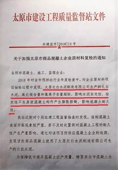 山西省太原市建設工程質(zhì)量監(jiān)督站此前發(fā)布的《關于加強太原市商品混凝土企業(yè)原料復檢的通知》稱,在2018年對全市預拌砼行業(yè)年檢時發(fā)現(xiàn),太原北白水泥制造有限公司生產(chǎn)的北白水泥,氧化鎂含量和氯離子含量超標,影響水泥安定性,安定性不良易使混凝土構件產(chǎn)生膨脹裂縫,影響混凝土耐久性。