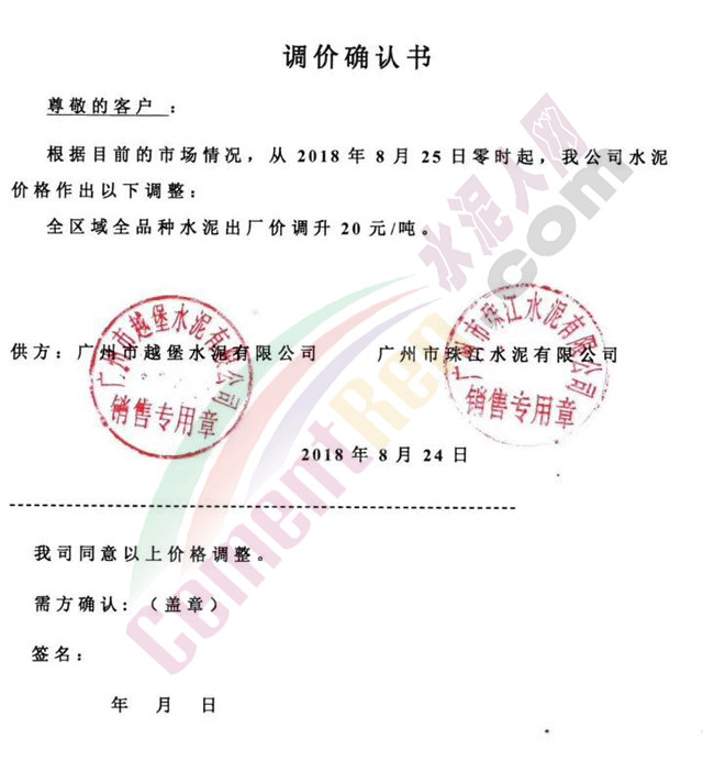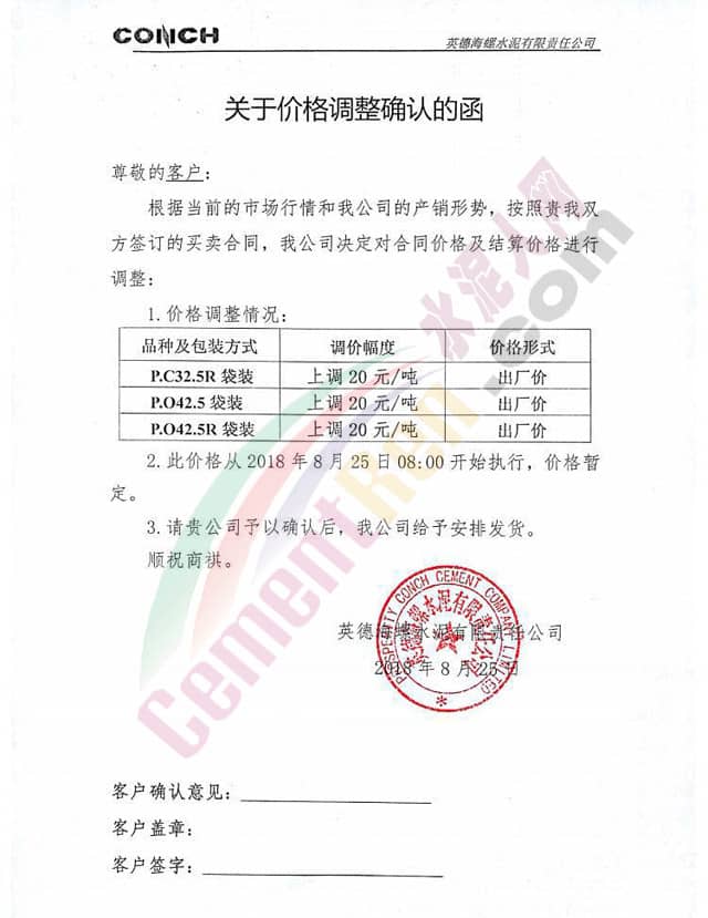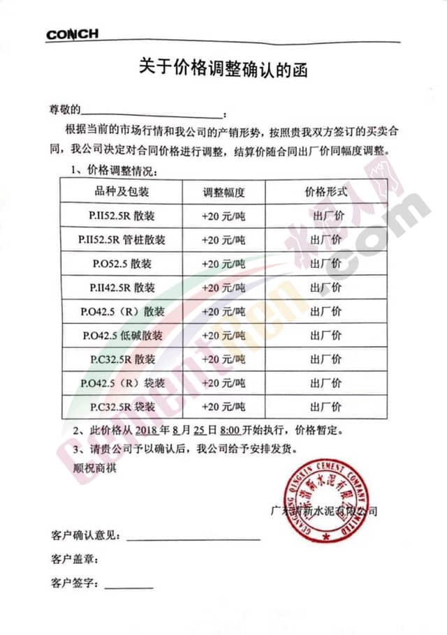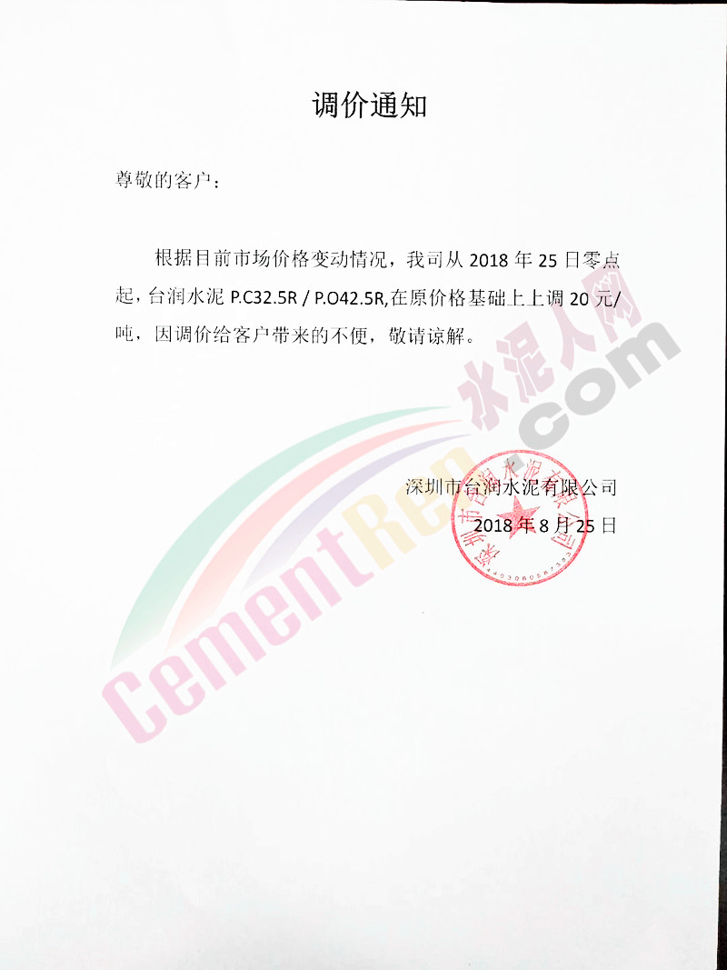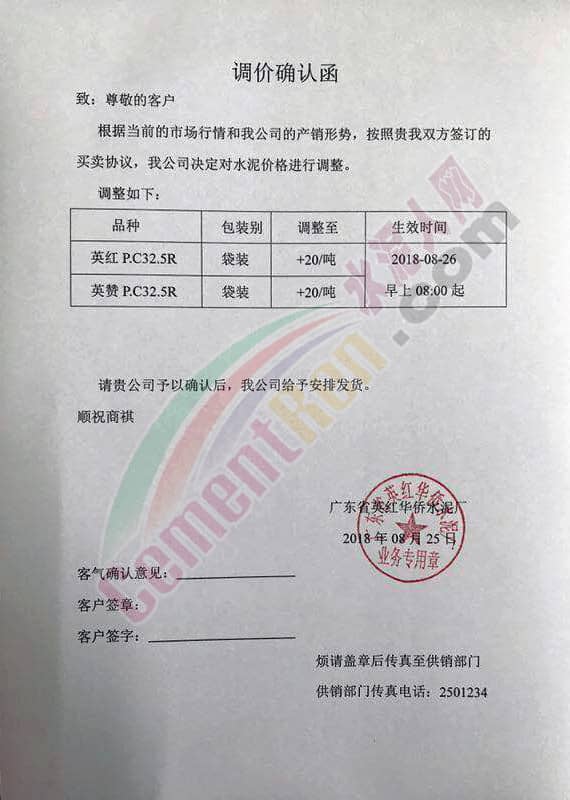 【水泥人網】近兩日廣東珠三角區(qū)域多家企業(yè)發(fā)布提價通知稱上調水泥價格。 一、海螺水泥(三家工廠) 英德海螺、清新海螺、佛山海螺發(fā)布提價通知,自2018年8月25日起各標號水泥在原價基礎上上調20元/噸。 二、臺泥英德 三、華潤水泥 四、中材亨達 五、英紅華僑水泥 六、石井德慶水泥 七、七星水泥廠 八、越堡水泥 九、中材天山(云浮)水泥 十、深圳市臺潤水泥