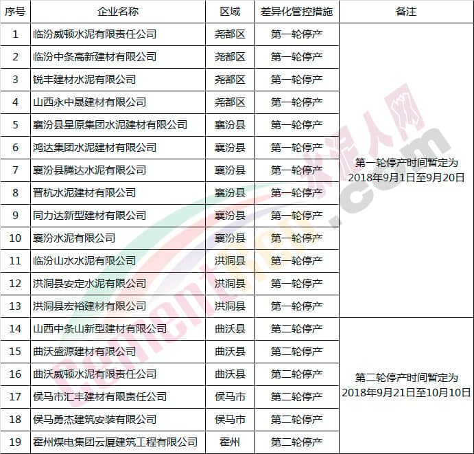 第一輪停產(chǎn)時(shí)間暫定為9月1日~9月20日為,管控區(qū)域?yàn)閳蚨紖^(qū)、襄汾縣、洪洞縣等。