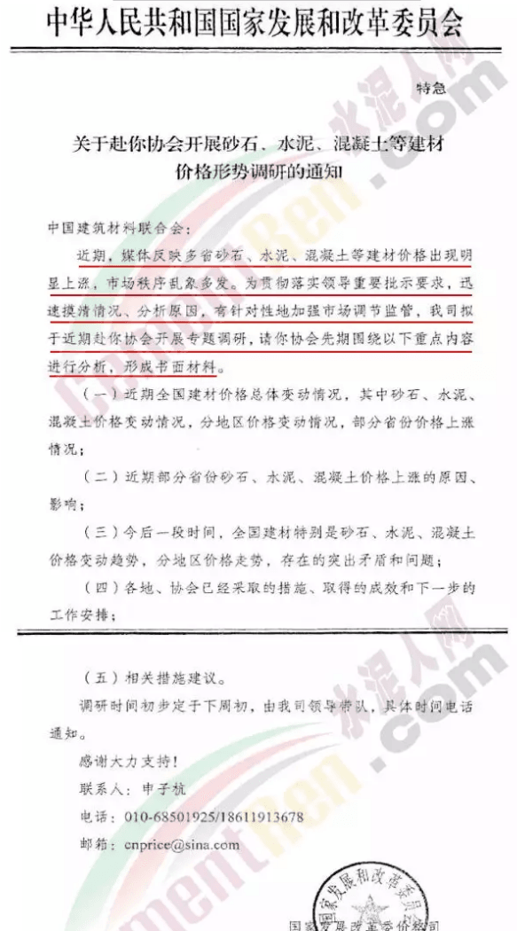 國(guó)家發(fā)展改革委價(jià)格司于9月5日發(fā)特急文件給中國(guó)建筑材料聯(lián)合會(huì)稱:近期媒體反映多省砂石、水泥、混凝土等建材價(jià)格出現(xiàn)明顯上漲,市場(chǎng)秩序亂象多發(fā)。為貫徹落實(shí)領(lǐng)導(dǎo)重要批示要求,迅速摸清情況、分析原因,有針對(duì)性的加強(qiáng)市場(chǎng)調(diào)節(jié)監(jiān)管,國(guó)家發(fā)展改革委價(jià)格司擬于近期赴中國(guó)建筑材料聯(lián)合會(huì)開(kāi)展專題調(diào)研,請(qǐng)中國(guó)建筑材料聯(lián)合會(huì)先期圍繞以下重點(diǎn)內(nèi)容進(jìn)行分析,形成書(shū)面材料。