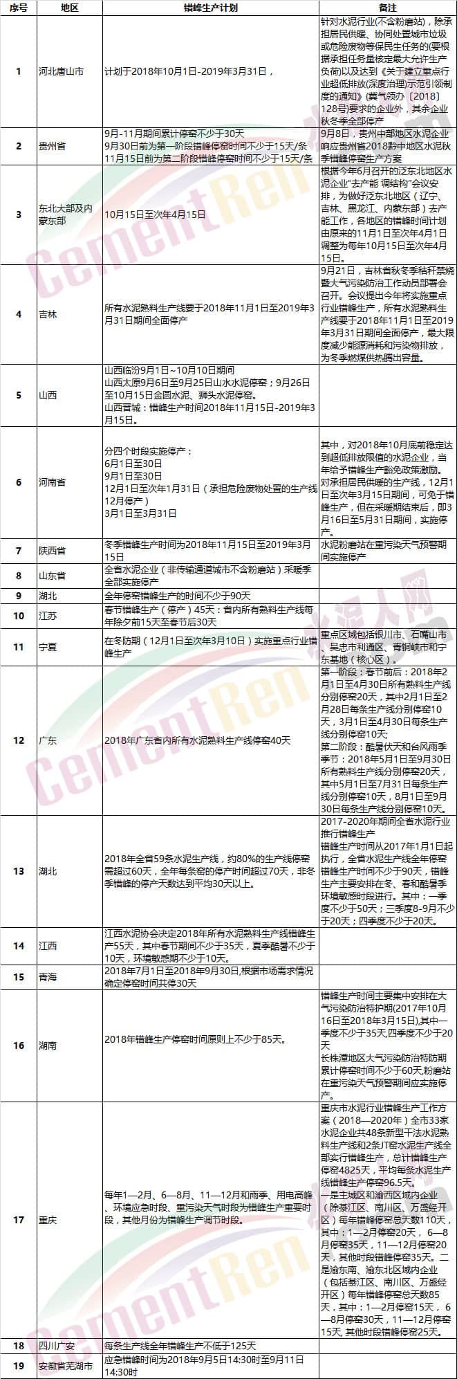 北京、天津、河北、山西、內(nèi)蒙古、遼寧、吉林、黑龍江、山東、河南、陜西、甘肅、青海、寧夏、新疆等15個省(自治區(qū)、直轄市)所有水泥生產(chǎn)線,包括利用電石渣生產(chǎn)水泥的生產(chǎn)線都應進行錯峰生產(chǎn)。