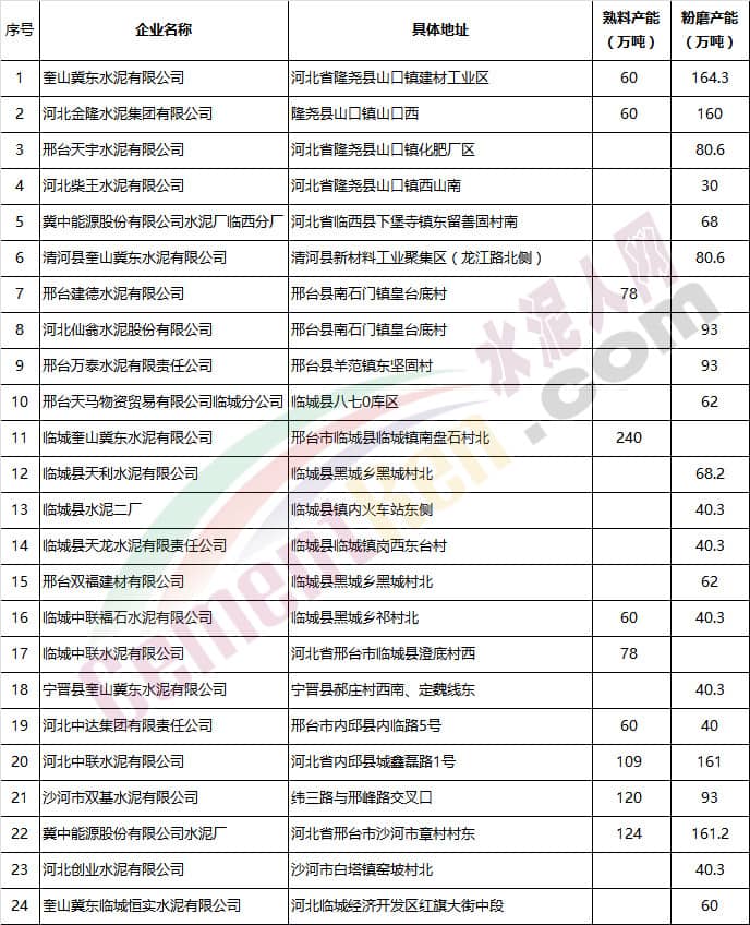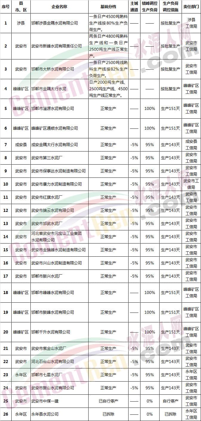(一)水泥企業(yè)(不含粉磨站)除承擔居民供暖、協同處置城市垃圾或危險廢物及高速公路重點建設項目等保民生任務的,要根據承擔任務量核定最大允許生產負荷外,其余企業(yè)錯峰期間全部停產,在2018年9月底前報邯鄲市人民政府備案。水泥粉磨站按通用指標進行績效評價,最終確定企業(yè)采暖季錯峰生產方案。9月底未按標準驗收合格的企業(yè)停產。
