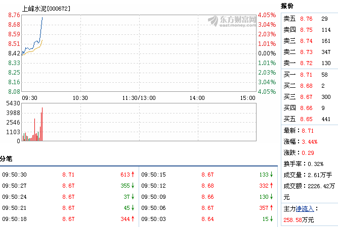 10月10日,上峰水泥盤中快速上漲,5分鐘內漲幅超過2%,截至9點50分,報8.71元,成交2226.42萬元,換手率0.32%。