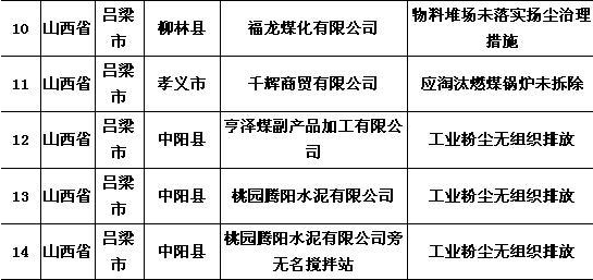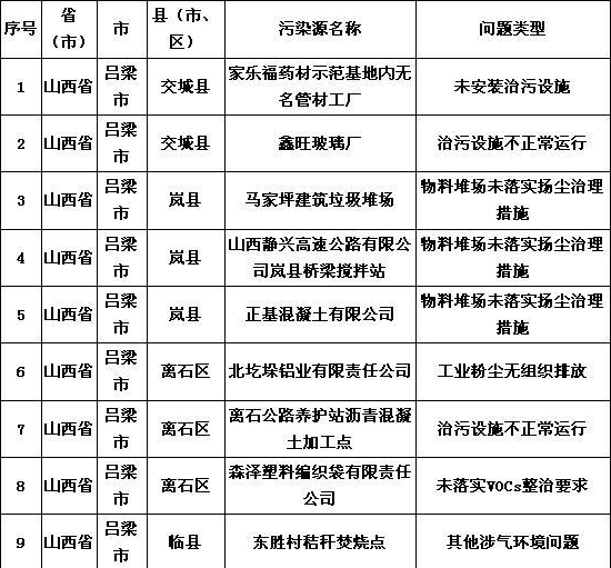 其中,山西省晉中市昔陽(yáng)縣1家(排氣筒高度不足15米),臨汾市安澤縣1家(排氣筒高度不足15米),運(yùn)城市臨猗縣1家(煙囪高度不足35米)、夏縣1家(排氣筒高度不足15米);河南省洛陽(yáng)市西工區(qū)1家(排氣筒高度不足15米)企業(yè)廢氣排放口設(shè)置未達(dá)到環(huán)評(píng)要求。