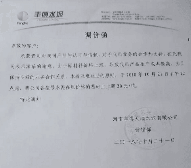 河南省豐博天瑞水泥有限公司在調價函中決定公司各型號水泥在原價格的基礎上上調20元/噸。