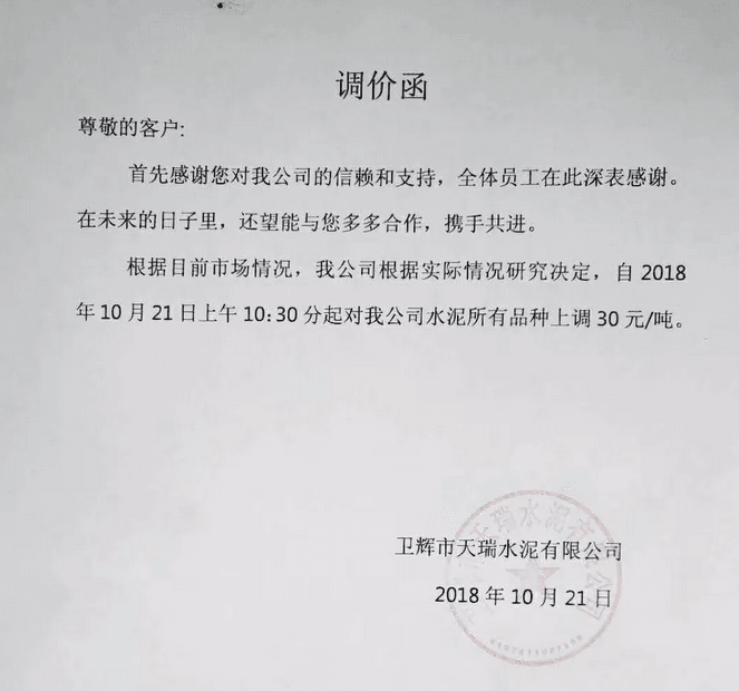 衛(wèi)輝市天瑞水泥有限公司在調價函中決定對公司水泥所有品種上調30元/噸。