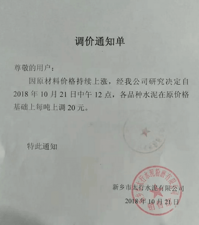 新鄉(xiāng)市太行水泥有限公司在調價函中決定公司內各品種水泥在原價格基礎上每噸上調20元。