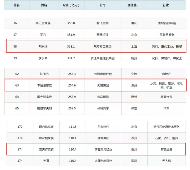 水泥行業(yè),東方希望集團(tuán)劉永行榮居榜單第38位;天瑞集團(tuán)李留法家族榮居第63位;寧夏天元錳業(yè)賈天將家族榮居第174位。