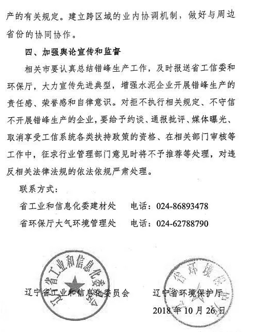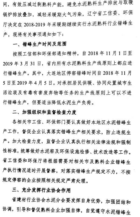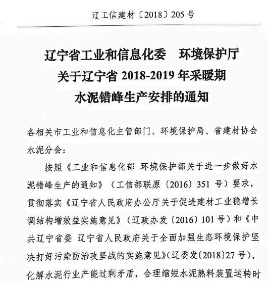 遼寧省工信委和遼寧環(huán)保廳下發(fā)了2018-2019年采暖期水泥錯(cuò)峰生產(chǎn)安排,通知要求,自2018年11月1日至2019年3月31日,省內(nèi)水泥熟料生產(chǎn)原則上都進(jìn)行錯(cuò)峰生產(chǎn),大連地區(qū)時(shí)間為2018年11月5日至2019年4月5日,對(duì)承擔(dān)居民供暖、協(xié)同處置城市生活垃圾及有毒有害廢棄物任務(wù)的生產(chǎn)線可以不進(jìn)行錯(cuò)峰,但要適當(dāng)降低水泥生產(chǎn)負(fù)荷。
