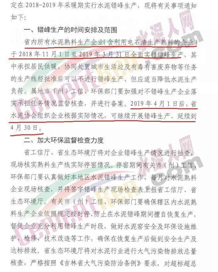 據(jù)水泥人網(wǎng)了解,近日吉林省工信廳、生態(tài)環(huán)境廳聯(lián)合發(fā)布《關(guān)于吉林省2018-2019年采暖期實行水泥錯峰生產(chǎn)的通知》(以下簡稱“通知”),通知明確要求,省內(nèi)所有水泥熟料生產(chǎn)企業(yè)(含利用電石渣生產(chǎn)熟料的企業(yè))于2018年11月1日至2019年3月31日全面實行錯峰生產(chǎn),其中承擔(dān)居民供暖、協(xié)同處置城市生活垃及有毒有害廢棄物等任務(wù)的生產(chǎn)線經(jīng)批準(zhǔn)后可以不進(jìn)行錯峰生產(chǎn),但應(yīng)適當(dāng)降低水泥生產(chǎn)負(fù)荷。屬地市(州)工信、環(huán)保部門要加強(qiáng)對不錯峰生產(chǎn)企業(yè)落實承擔(dān)任務(wù)情況監(jiān)督核查,并進(jìn)行備案。2019年4月1日后,省水泥協(xié)會組織企業(yè)根據(jù)實際情況,可繼續(xù)開展錯峰生產(chǎn),延續(xù)到4月30日。