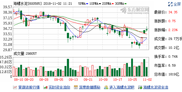 11月01日滬股通成交信息顯示,滬股通資金持有海螺水泥3.63億股,較前一交易日增持745.31萬股,持股市值為121.92億元,較前一交易日增加5.60億元。滬股通持股數(shù)量占流通股本比例為9.07%,占總股本比例為6.85%。