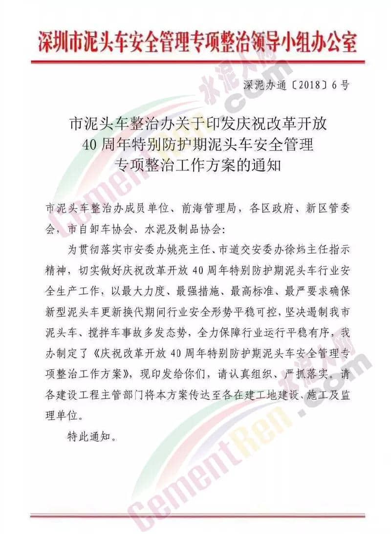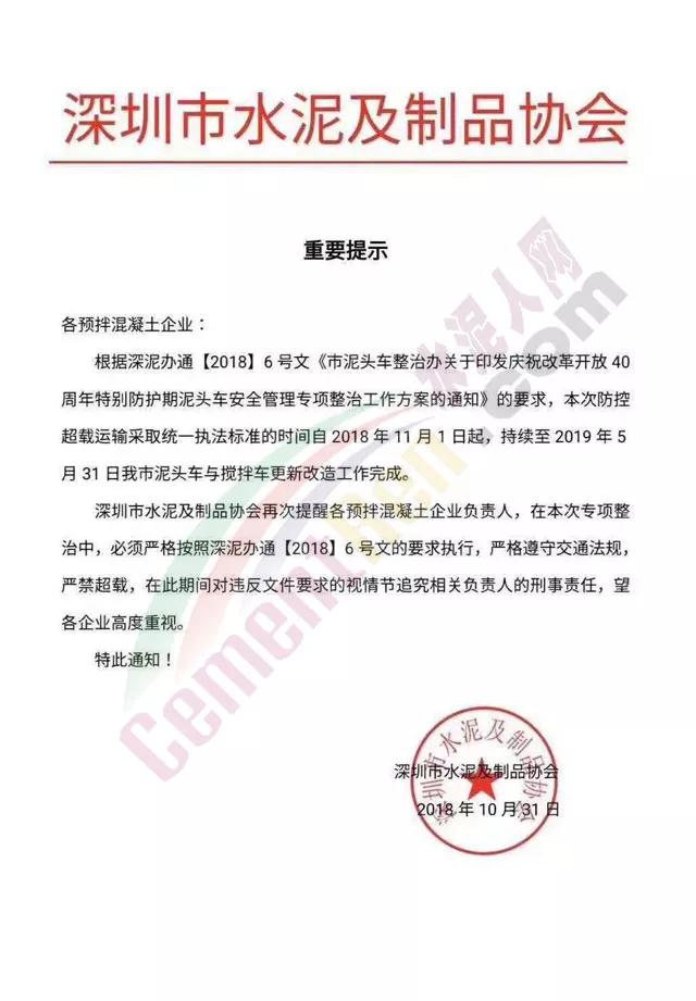 10月31日深圳市水泥及制品協(xié)會發(fā)布重要提示稱,根據(jù)深泥辦通【2018】6號文《市泥頭車整治辦關(guān)于印發(fā)慶祝改革開放40周年特別防護(hù)期泥頭車安全管理專項(xiàng)整治工作方案的通知》的要求,本次防控超載運(yùn)輸采取統(tǒng)一執(zhí)法標(biāo)準(zhǔn)的時(shí)間自2018年11月1日起,持續(xù)至2019年月31日,深圳市泥頭車與攪拌車更新改造工作完成。