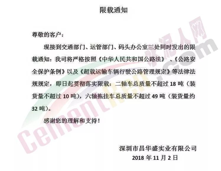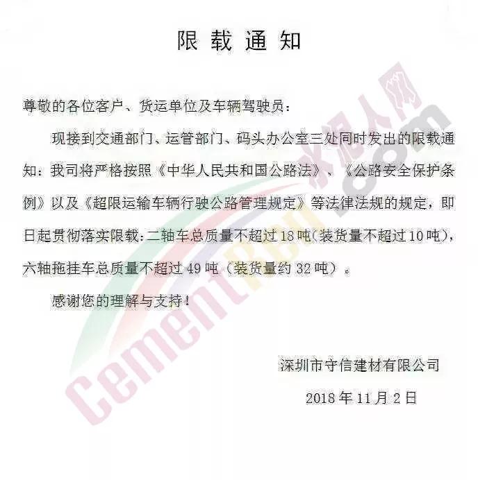 接到通知后,深圳市各區(qū)域建材相關(guān)企業(yè)紛紛下發(fā)通知,稱嚴(yán)格執(zhí)行相關(guān)文件要求。深圳市守信建材有限公司、深圳市昌華盛實(shí)業(yè)有限公司等企業(yè)發(fā)布限載通知稱,接到交通部門、運(yùn)管部門、碼頭辦公室三處同時(shí)發(fā)出的限載通知。公司將嚴(yán)格按照《中華人民共和國公路法》、《公路安全保護(hù)條例》以及《超限運(yùn)輸車輛行駛公路管理規(guī)定》等法律法規(guī)的規(guī)定,即日起貫徹落實(shí)限載:二軸車總質(zhì)量不超過18噸(裝貨量不超過10噸),六軸拖掛車總質(zhì)量不超過49噸(裝貨量約32噸)。原文如下: