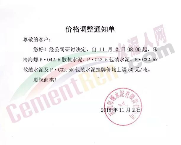 根據(jù)當(dāng)前錯峰生產(chǎn)、市場行情及原材料價格上漲情況,經(jīng)公司研究決定,自2018年11月2日上午8時起,對PC32.5袋裝及散裝價格上調(diào)30元/噸;PO42.5袋、散裝、緩凝及52.5袋、散上調(diào)50元/噸。