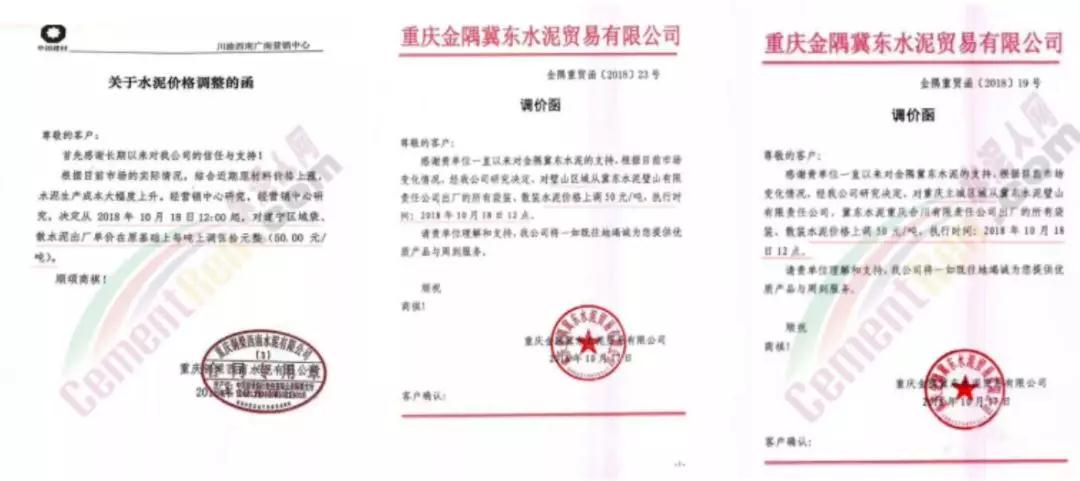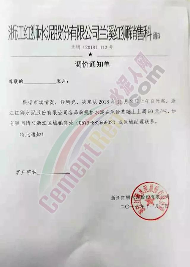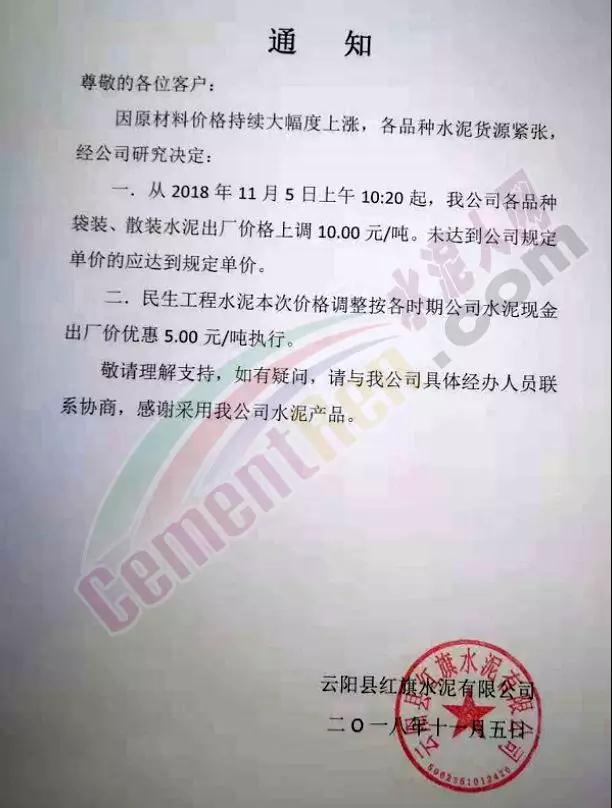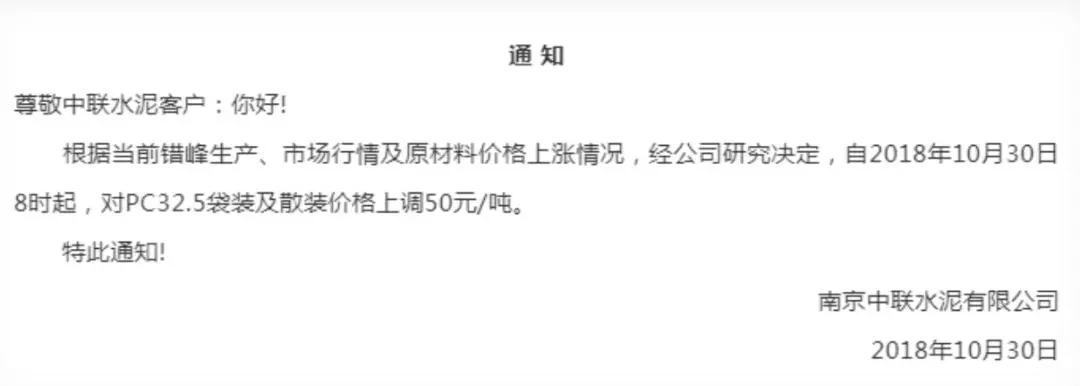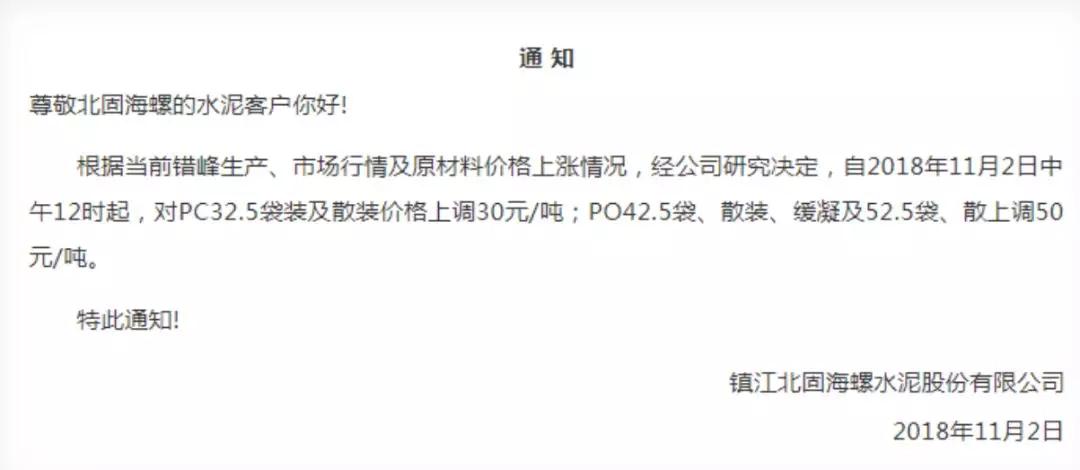 11月2日南京中聯(lián)水泥、鎮(zhèn)江北固海螺水泥上調(diào)水泥價(jià)格,其中32.5級(jí)水泥上調(diào)30元/噸。42.5級(jí)以上高標(biāo)號(hào)水泥上調(diào)50元/噸。漲價(jià)通知如下: