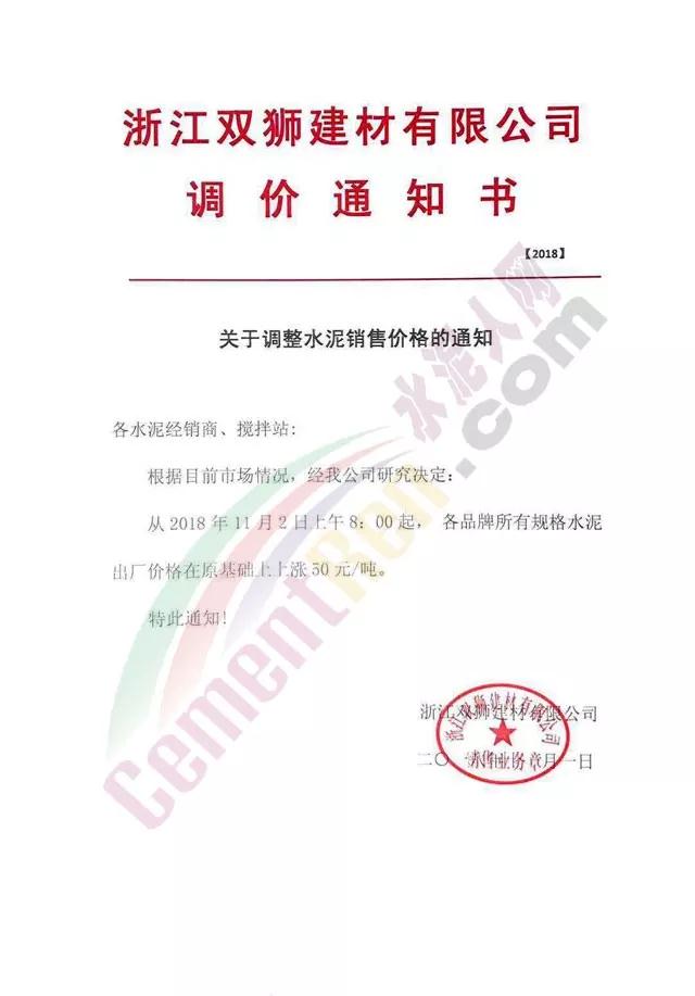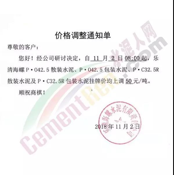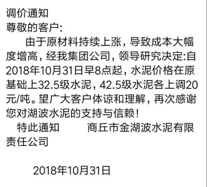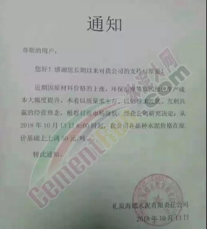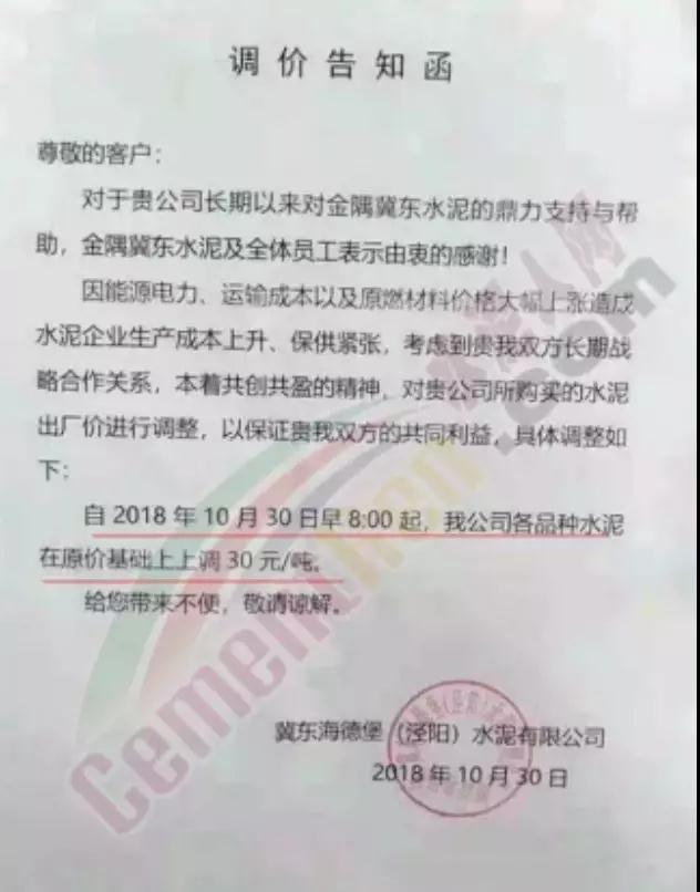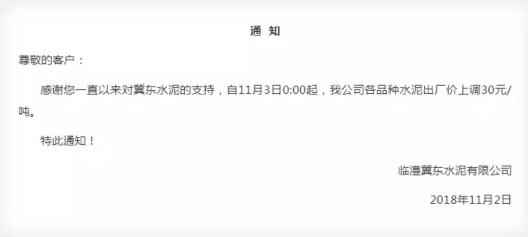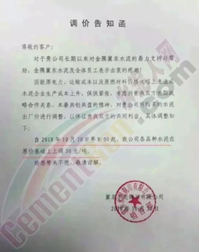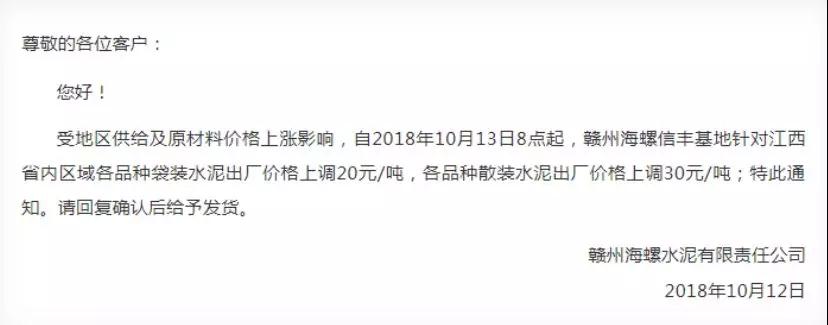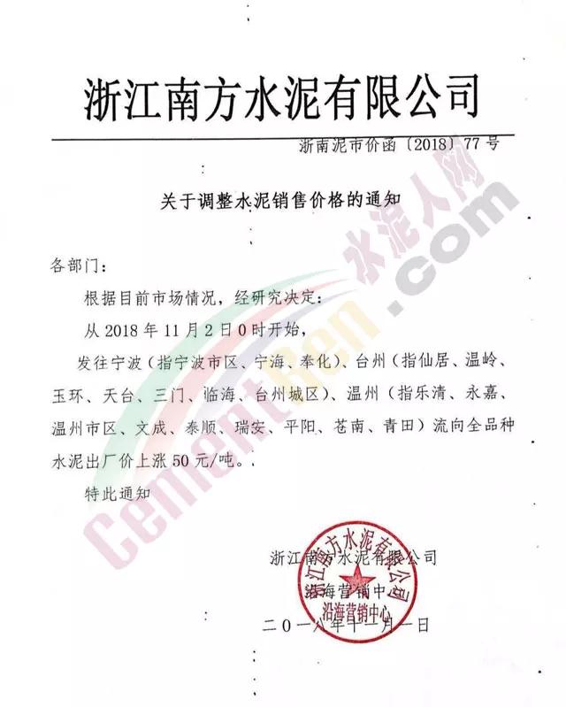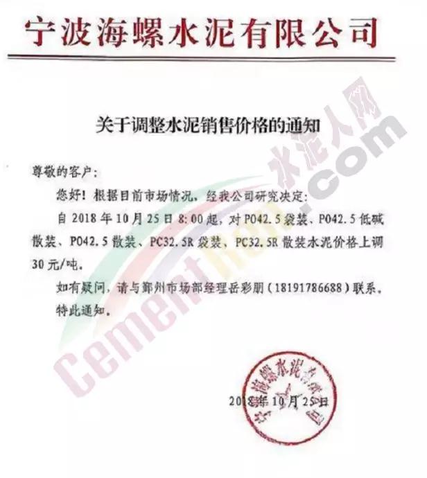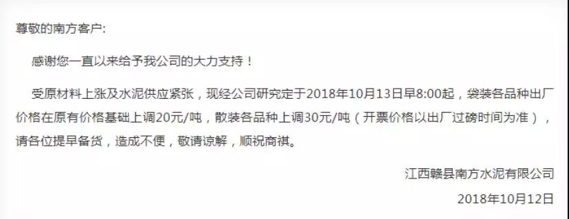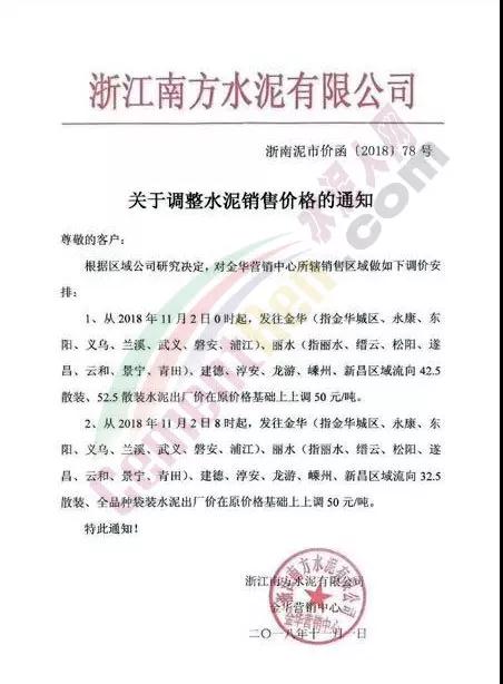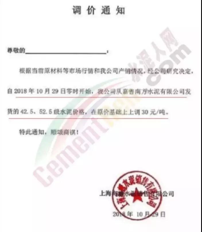 10月29日上海海螺水泥銷(xiāo)售有限公司發(fā)了一份南方水泥的漲價(jià)通知,漲價(jià)函稱(chēng)經(jīng)公司研究決定自10月29日零時(shí)開(kāi)始,公司從嘉善南方水泥發(fā)貨的42.5、52.5級(jí)水泥價(jià)格,在原價(jià)基礎(chǔ)上上調(diào)30元/噸。